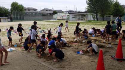 1年生が校庭の砂場で、砂に触れながらいろいろな形をつくる活動をしました。