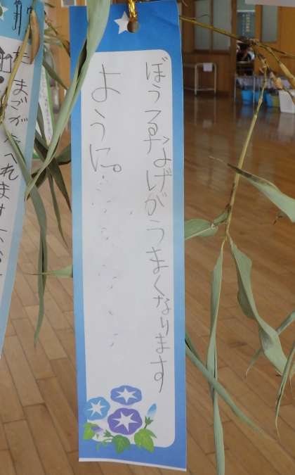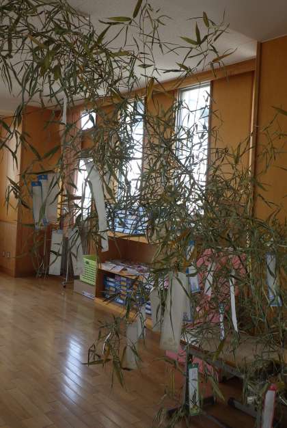 校内整備員の鈴木さんに切っていただいた竹や模造紙等に、子どもたちの願いが書かれた短冊が飾られていました。