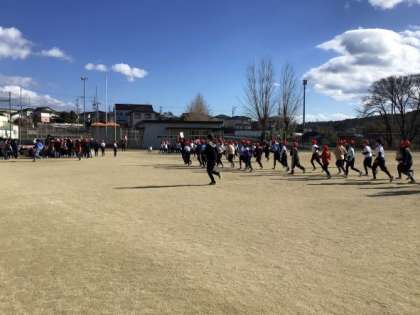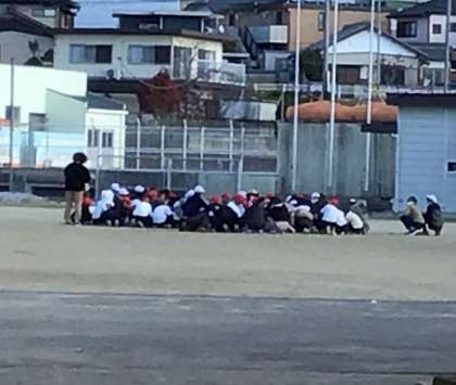 外に出ていた子は、運動場の中央あたりへ集まりしゃがみました。