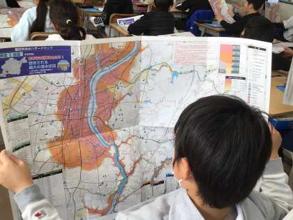 「豊田市洪水ハザードマップ美里・益富中学校区」を見て、自分の家や通学路の洪水時に想定される最大浸水状況を各自確認しました。