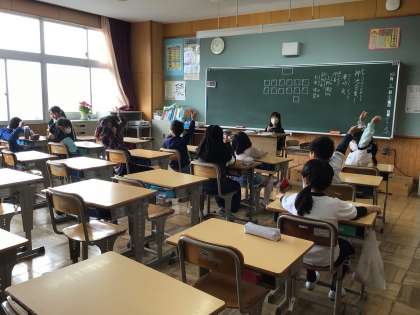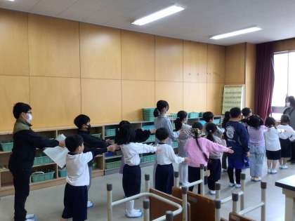 通学団会では、新1年生のお迎えや集合時刻、並び方の確認をしました。
