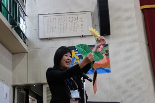 みんなが喜んで笑顔がいっぱいになったので、校長の話では、以前読み聞かせをした『ともだちのたね』にちなんで、豊田市のひまわりの種賞シールの種から花を咲かせて見せました。(色画用紙で仕掛けました。)