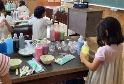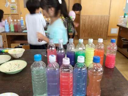 ペットボトルに入れた水に絵の具を混ぜて、色の美しさを味わう授業です。
