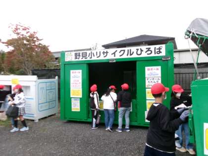 学校に戻ってからは、早速「野見小リサイクルひろば」に回収物を入れました。
