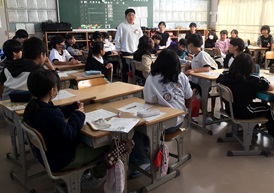 骨の絵の描かれた白い筒2本を、それぞれの代表児童が握ると、片方はぐしゃっと潰れました。もう一方は中が詰まっていて潰れません。