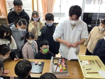地域の和菓子屋さんにご来校いただき、目の前で和菓子を作る様子を見させていただきました。