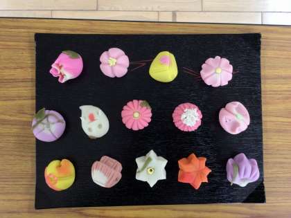 芸術的で美味しそうな和菓子(写真)にうっとりしながら、自分の粘土試作に生かそうと真剣でした。