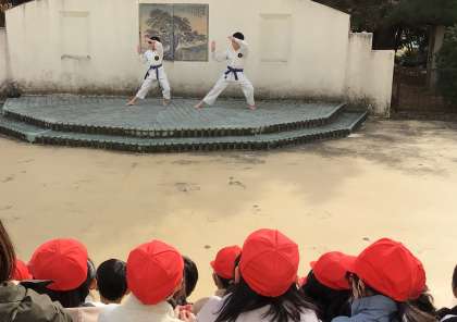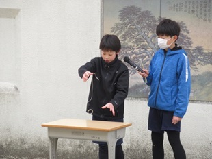 校庭の法眼広場のステージで長放課・昼放課に行うきらめきミニ発表会で今日は、マジックショー、空手パフォーマンス、実写アキネーターの3つの発表がありました。