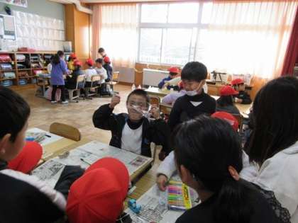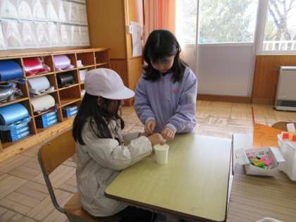 2年生が1年生に手作りおもちゃの作り方を教えてあげて一緒に遊ぶ「おもちゃランドへようこそ」の授業がありました。