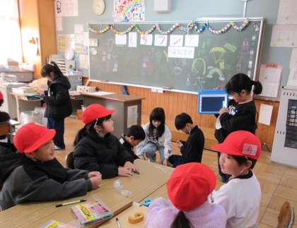 学習用タブレットを使っておもちゃの作り方を1年生に分かりやすく説明し、できたおもちゃで仲良く遊びました。