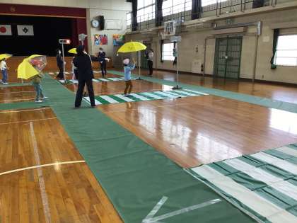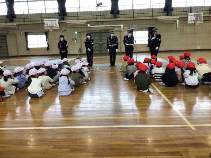 豊田みよし交通安全協会の指導員の皆さんにご来校いただき、1年生が体育館で交通ルールを学びました。