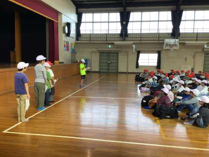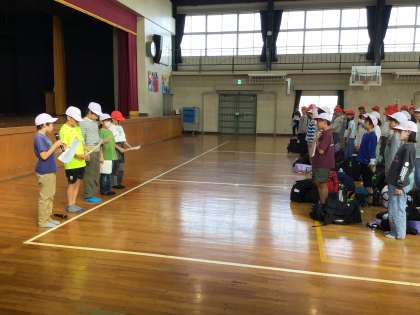 体育館で出発式をしていよいよ六所山へ。行ってきます。