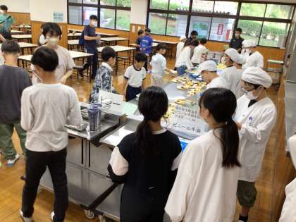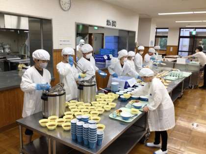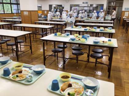 どんぐり食堂で朝食です。給食の時のように食事係がおかずを盛り付けます。