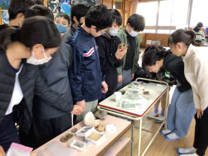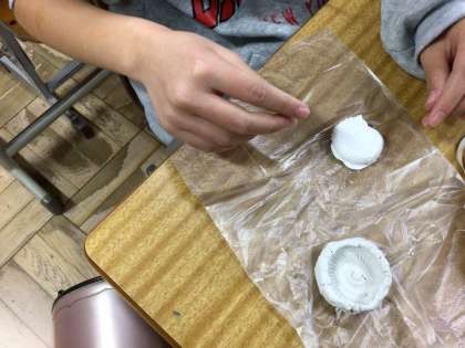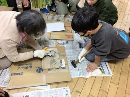 アンモナイトの型を取った粘土に石膏を流して固めてレオプリカを作ったり、たくさんの本物の化石を見せていただいたり、金づちで石を割って化石を発掘したりしました。
