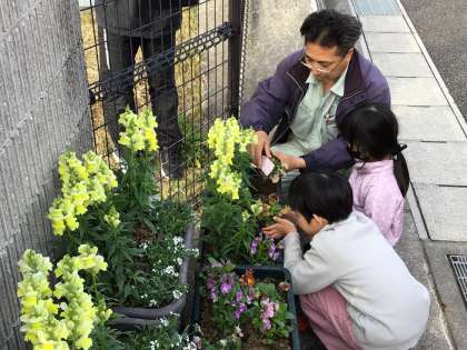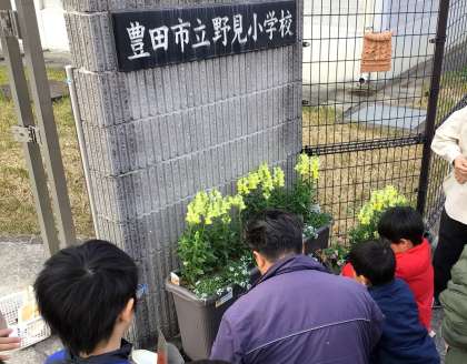 トヨタ生協メグリアさんがレジ袋収益金による環境活動の一環で、野見小学校にお花の苗とプランターをプレゼントしてくださいました。
