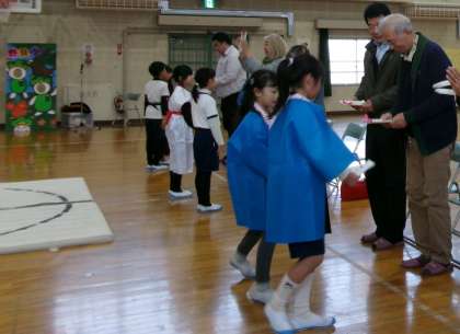 法眼学習で地域講師の方に教えていただいた「相撲」「巫女舞」「ちゃらぼこ太鼓」の発表と、講師の方へ感謝を伝える会が開かれました。
