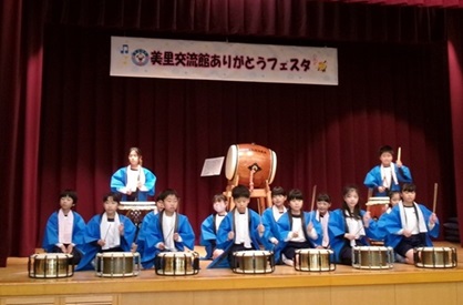 野見小3年伝統芸能「ちゃらぼこ」隊から、記念コンサートに出演しました。