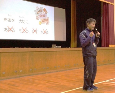 生徒指導担当者からは、楽しいスライドを交えて、お金や公園の使い方等の約束について話がありました。