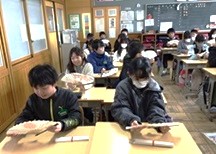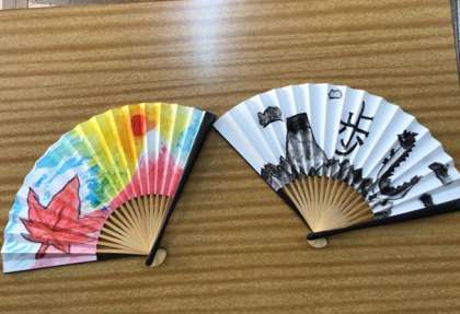 11月の修学旅行では入浴前のひと時に、「あかね屋」さんに宿まで来ていただき、伝統工芸体験「扇子の絵付け」を行いました。