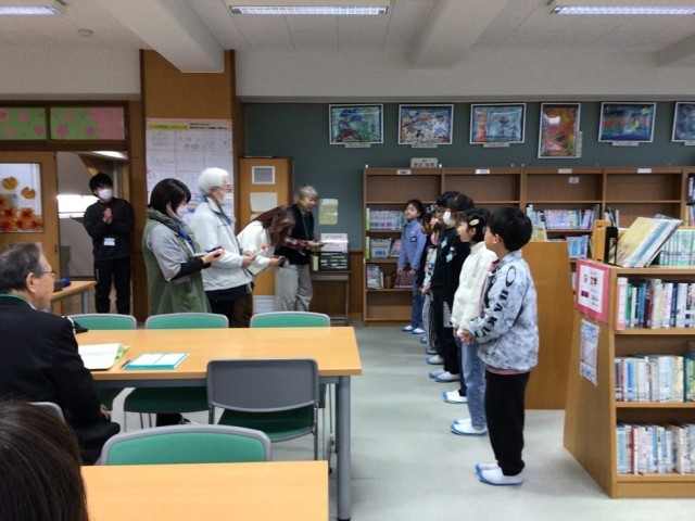 毎月楽しい本を読んでくださるボランティアさんに、教室や図書室でお礼を言いました。