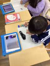 1年生の国語で学習用タブレットを見ながらノートに書く学習をしました。一度、下書きをしたものを先生が直して今日は清書。先生が直した部分を学習用タブレットで写真を撮り、それを見ながらみんな集中して丁寧に書...