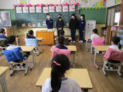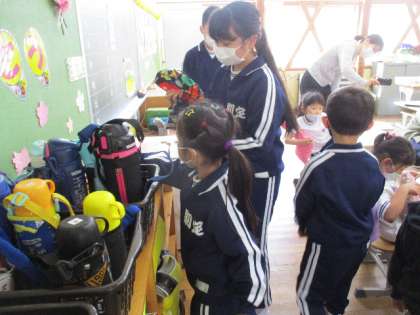 4月7日(木)の朝、6年生が1年生の朝の支度のお手伝いをしてくれました。優しく声をかけながら、いろいろなものの置き場所も教えてくれました。
