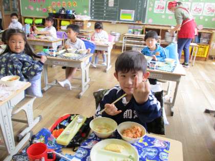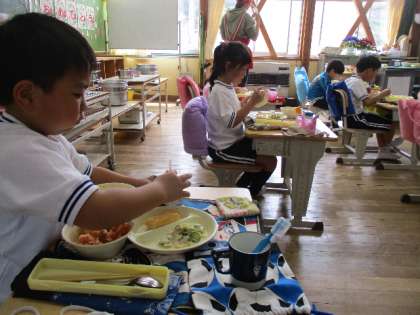 4月7日(木)、1年生初めての給食です。もりもり食べています。とても頼もしいです。