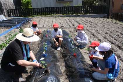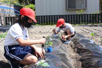 3年 夏野菜の苗 公開日 2022/04/12 更新日 2022/04/12 各学年から 4月12日(火)、3年生は畑に夏野菜の苗を植えました。植える苗は、自分で調べて一人一人が決めたものです。暑い日差しの中、おいしい野菜ができるように、がんばって植えました。 3年