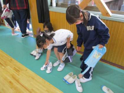 体育館シューズ 公開日 2022/04/12 更新日 2022/04/12 校長室から 4月11日(月)と12日(火)は、朝の活動で全員が体育館シューズに履き替えました。何しろ初めてのことなので大変ですが、意外とスムースに履き替えることができました。集会室、みんなで大切に使っていきましょう。