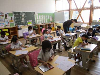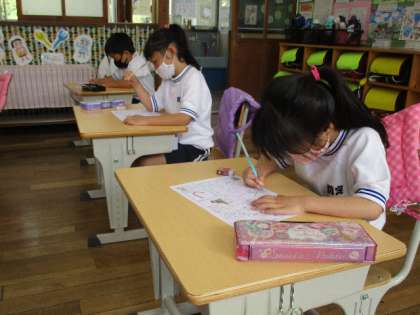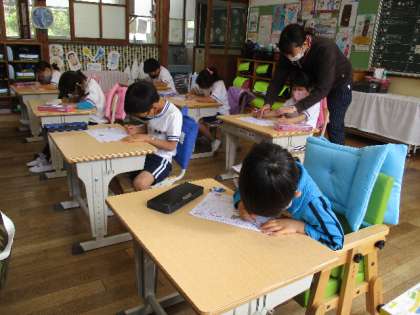 4月19日(火)、1年生はひらがなの「つ」と「く」の練習です。しっかりなぞって字を書くと、周りの絵の線もしっかりとなぞります。花丸をもらって、大喜びの1年生でした。