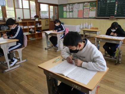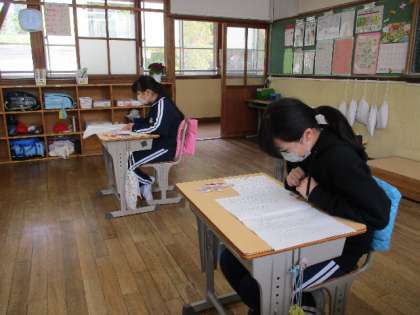 4月19日(火)、6年生は全国学力学習状況調査です。集中して、問題に取り組む6年生です。