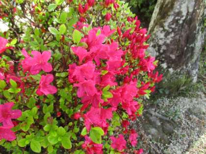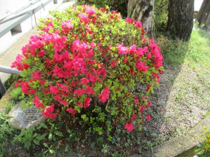 4月19日(火)、玄関横のサツキの赤い花が開き始めました。新緑がまぶして季節の到来です。