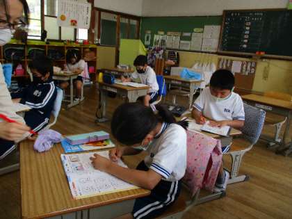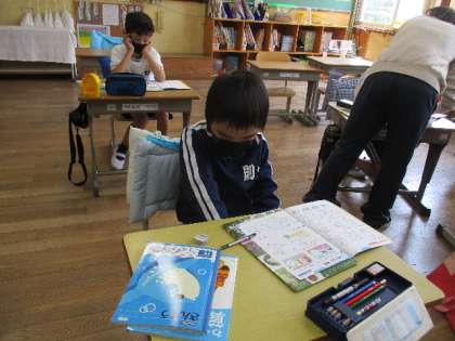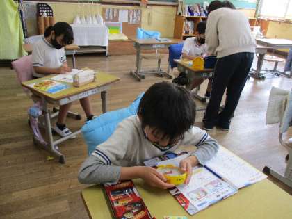 4月20日(水)、2年生は算数セットの時計を使って、時間の学習です。時計をいろいろ動かしながら、問題に取り組んでいます。