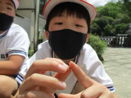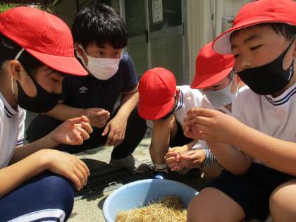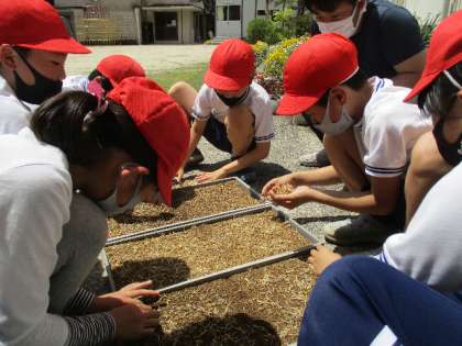 4年 もみまき 公開日 2022/04/22 更新日 2022/04/22 各学年から 4月22日(金)、お米の作り方を教えてくださる川合さんが、もみ(芽や根が出ています)を持ってきてくださいました。そこで早速、4年生が土(これも川合さんが用意してくださったもの)にもみをまきました。成長の様子を観察していきます。 川合さん、今年もよろしくお願いします。 4年