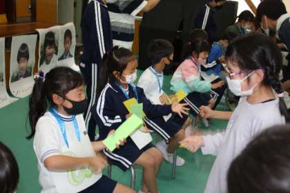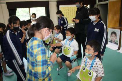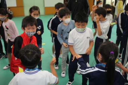 続いては「進化ゲーム」です。カエル・ヘビ・犬・ゾウ・人間などのパネルをつけた1年生とみんながジャンケンして、どんどん進化していきます。10回も進化を繰り返した子もいて、大盛り上がりでした。