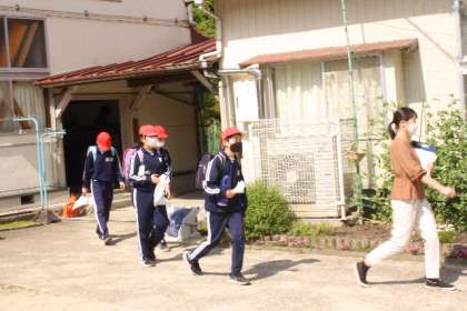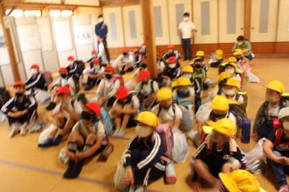 2時30分に避難開始の準備を始め、帰りの支度をして、正三記念館に移動します。正三記念館では、通学団ごとに並んでお迎えを待ちました。