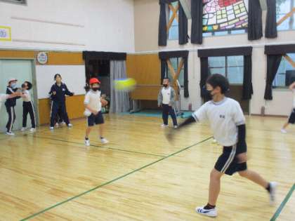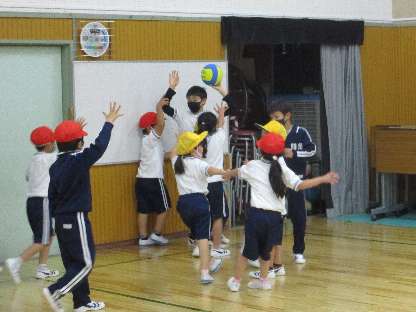 5月9日(月)、昼前から冷たい雨が降り出しました。わく2は、新しい床になった集会室でドッジボールです。高学年が組み分けを進めます。低学年は、高学年に尋ねながら、ゲームに入っていきます。