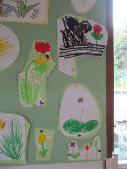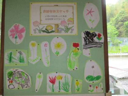 2年生教室前の掲示板には、春のお花の絵が飾られています。たくさんの春の絵は、見ているだけで元気になります。