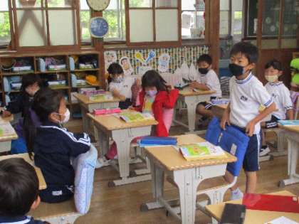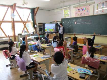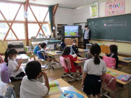 5月10日(火)、1年生は「何番目」の学習です。右から、左から、上から、下からなど、何番目に何があるかを尋ねると、みんな一斉に手が挙がります。やる気満々の1年生です。