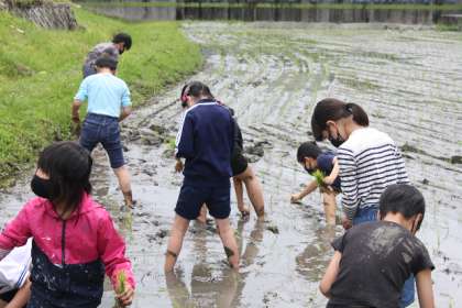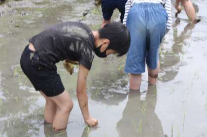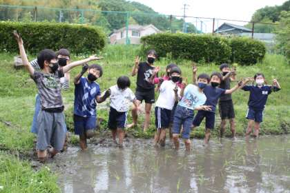 隅の方は、どろんこになりながら、みんなで手で植えていきました。泥だらけの笑顔がはじけています。