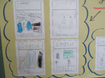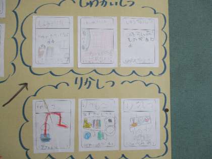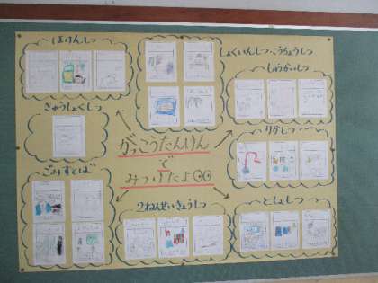 1年教室前の掲示板には、学校探検で発見したものが地図になって貼ってあります。見つけたものが、絵と文で表現されています。子どもたちのわくわくした気持ちが伝わってきます。