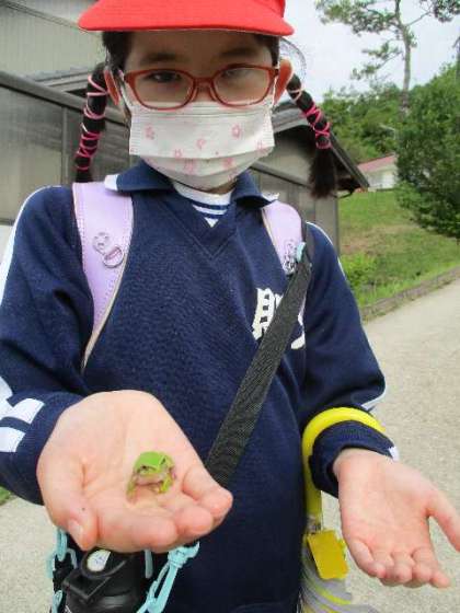 カエルの季節 公開日 2022/05/11 更新日 2022/05/11 校長室から 今年もカエルの季節になりました。カエル池に近づくと、トノサマガエルが池に勢いよく飛び込んでいきます。 登校してきた途端、校門坂の手すりにいるカエルを発見した子もいます。