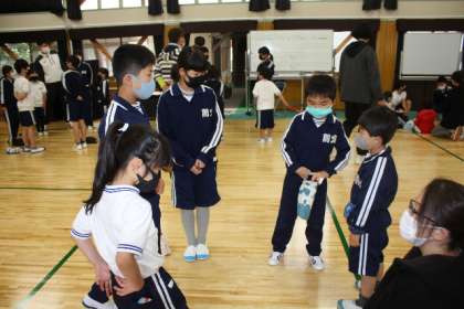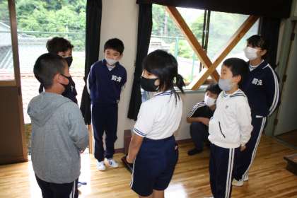 5月16日(月)、全校朝会では、縦割りグループに分かれて、ディスカッションです。「すきな食べ物」がテーマですが、前の人に行ったものに対して、自分の考えも言います。ちょっとした質問も出て、楽しい時間になりました。