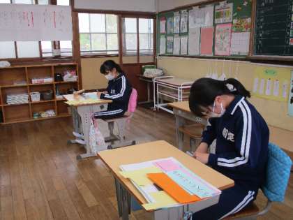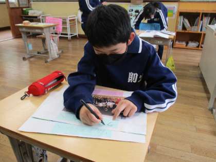 5月17日(火)、6年生は1年生へのプレゼントづくりにこつこつと取り組んでいます。全校が書いたメッセージを一つにまとめて、1年生に渡そうと計画しています。放課も使って頑張る6年生です。