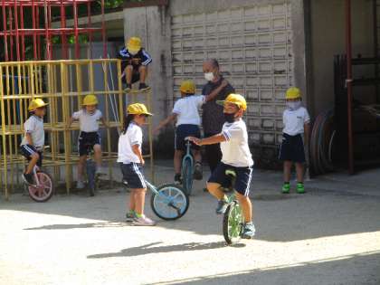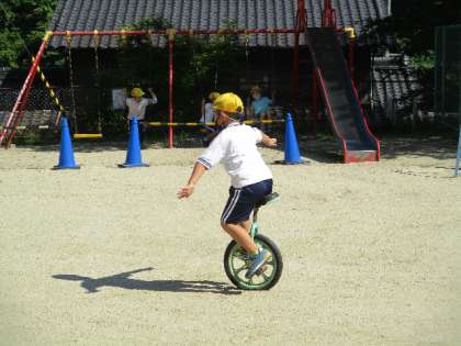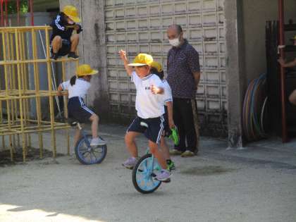 5月23日(月)はとても暑くなりました。ひよこタイムも、強い日差しが降り注いでいましたが、一輪車の練習をがんばっていた1年生。見るたびに、乗れる距離が長くなっています。