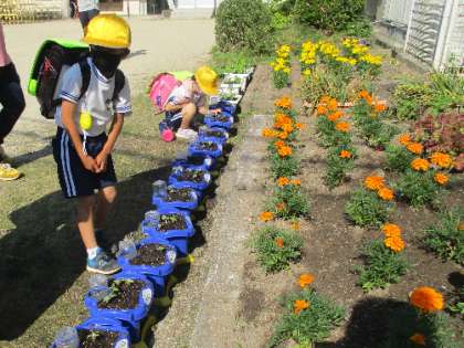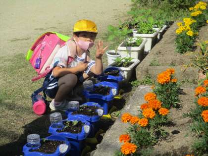 登校してきた1年生は朝顔の芽が出てきているかを確認しています。六つの芽が全部出るのか、とても楽しみなようです。