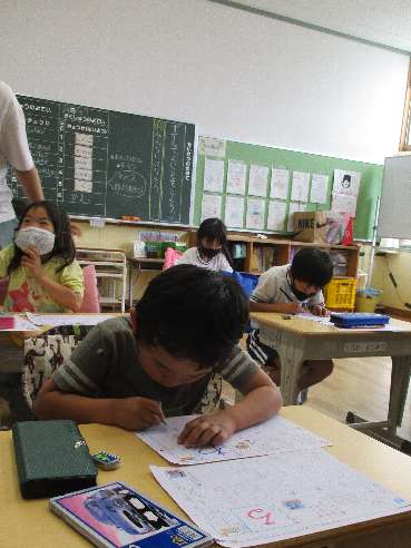 5月24日(火)、真剣に「わ」の練習をしている1年生。背中をぴんと伸ばし、足を床につけた姿勢の良さを先生に褒めていただていました。