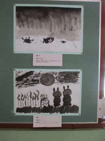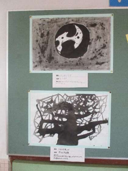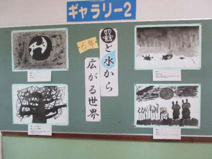 6年生教室前に飾られている図工作品です。墨の濃淡使って描かれた、モノクロームな作品が並んでいます。