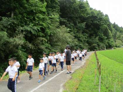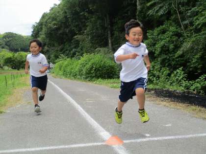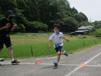 緑濃い中、二人ずつ農道を疾走しました。