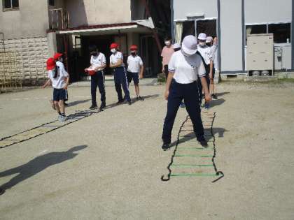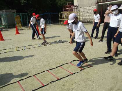 高学年は、校庭で敏捷性を高めるため、ラダーを使って体を動かします。